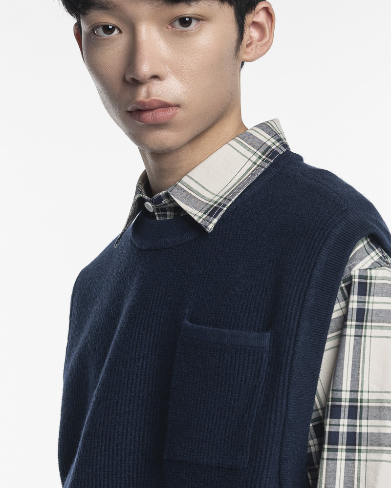 Yishion Men Knitted Round Neck Vest with Chest Pocket and Ribbed Hem (Dark Blue)